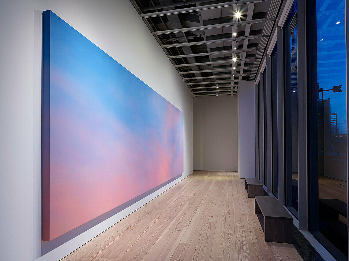 At the backdrop-painting studio at Warner Brothers in Hollywood, California, which Alex Israel occupies as his painting studio, the artist hired a backdrop painter who specializes in painting skies for movies to make this work. The painting’s extra-wide proportions echo those of CinemaScope, a panoramic movie format with stereo sound developed in the 1950s to create an enveloping experience for spectators beyond what the increasingly dominant format of television could achieve. Here, Israel transposes that sense of immersion into the space of the gallery, shifting the artifice of the backdrop into real space, and creating a sky that appears simultaneously natural and artificial.