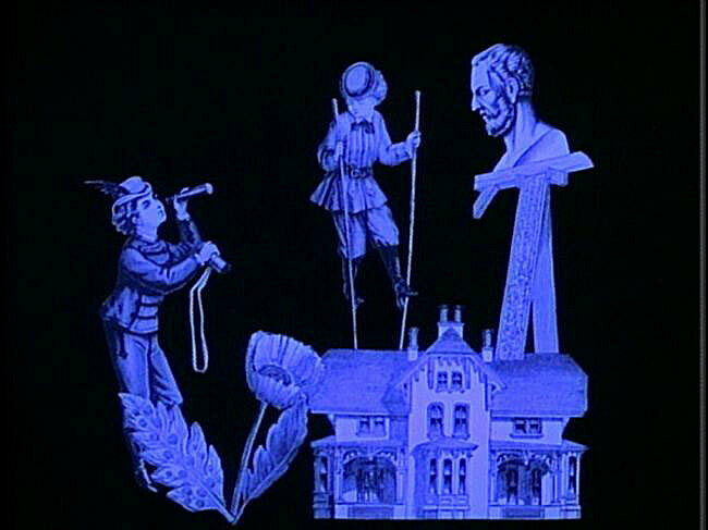 As part of the Dreamlands film series, Lawrence Jordan’s jewel-like blue-tinted animation film Carabosse is projected on a small white card sitting on a music stand in the center of the theater, with the soundtrack of Satie’s piano music filling the room. This contrast of scale between image and sound reverses the traditional hierarchy of cinema, and intensifies the film’s surreal, dreamlike quality, and its presence as an object.