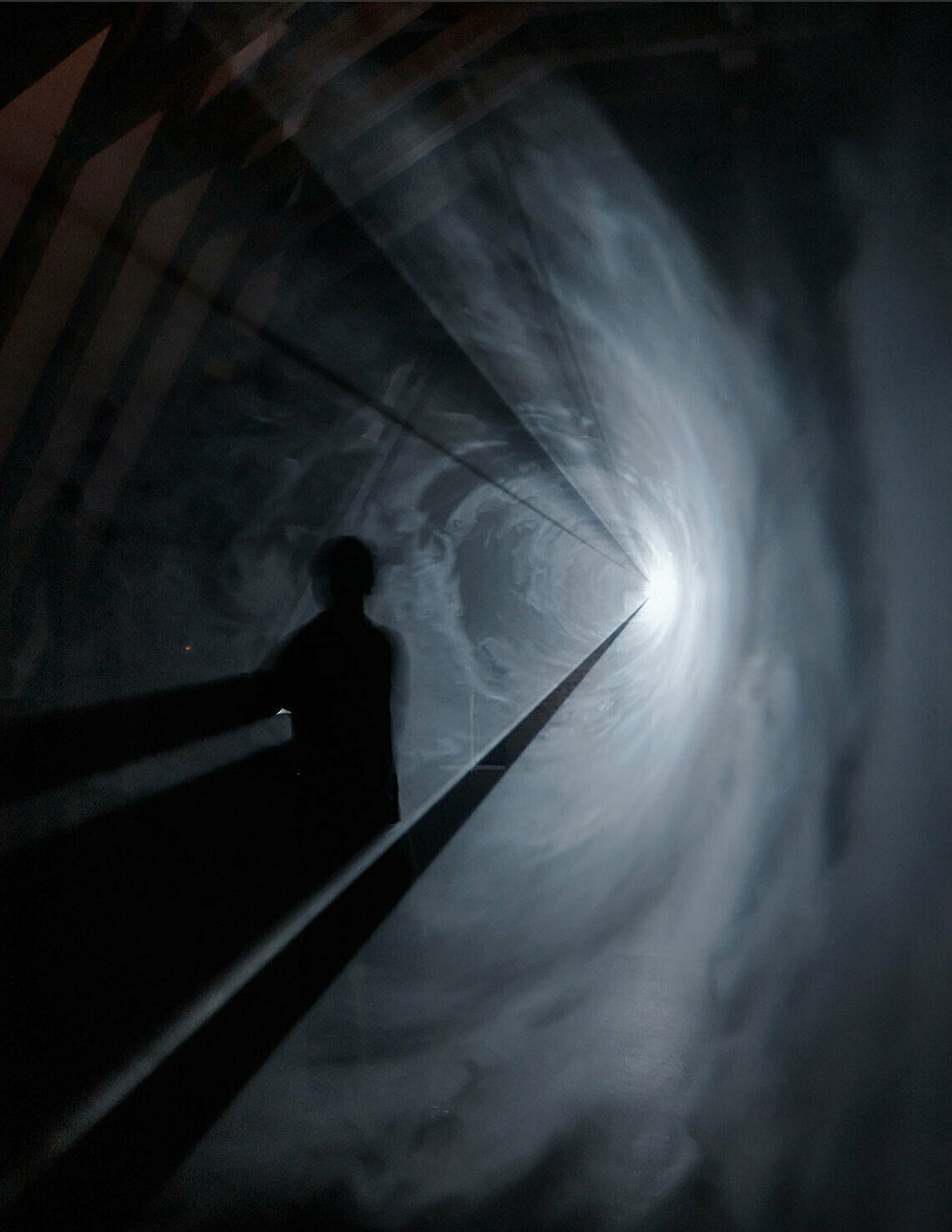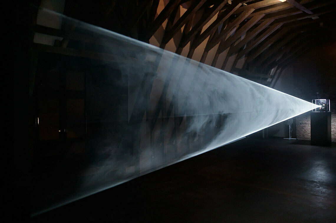 In Line Describing a Cone, film occupies a three- dimensional presence in space. A large white circle, hand-animated by Anthony McCall, gradually appears against a black background. The projector beam, made visible by a fine mist (originally cigarette smoke), evolves from a line to a hollow cone which we can move physically into and around, reorienting ourselves within the film itself rather than passively observing it. McCall’s combination of volume and temporality fuses the properties of film, sculpture, performance, and conceptual art, creating a spatial analogue for the experience of time.