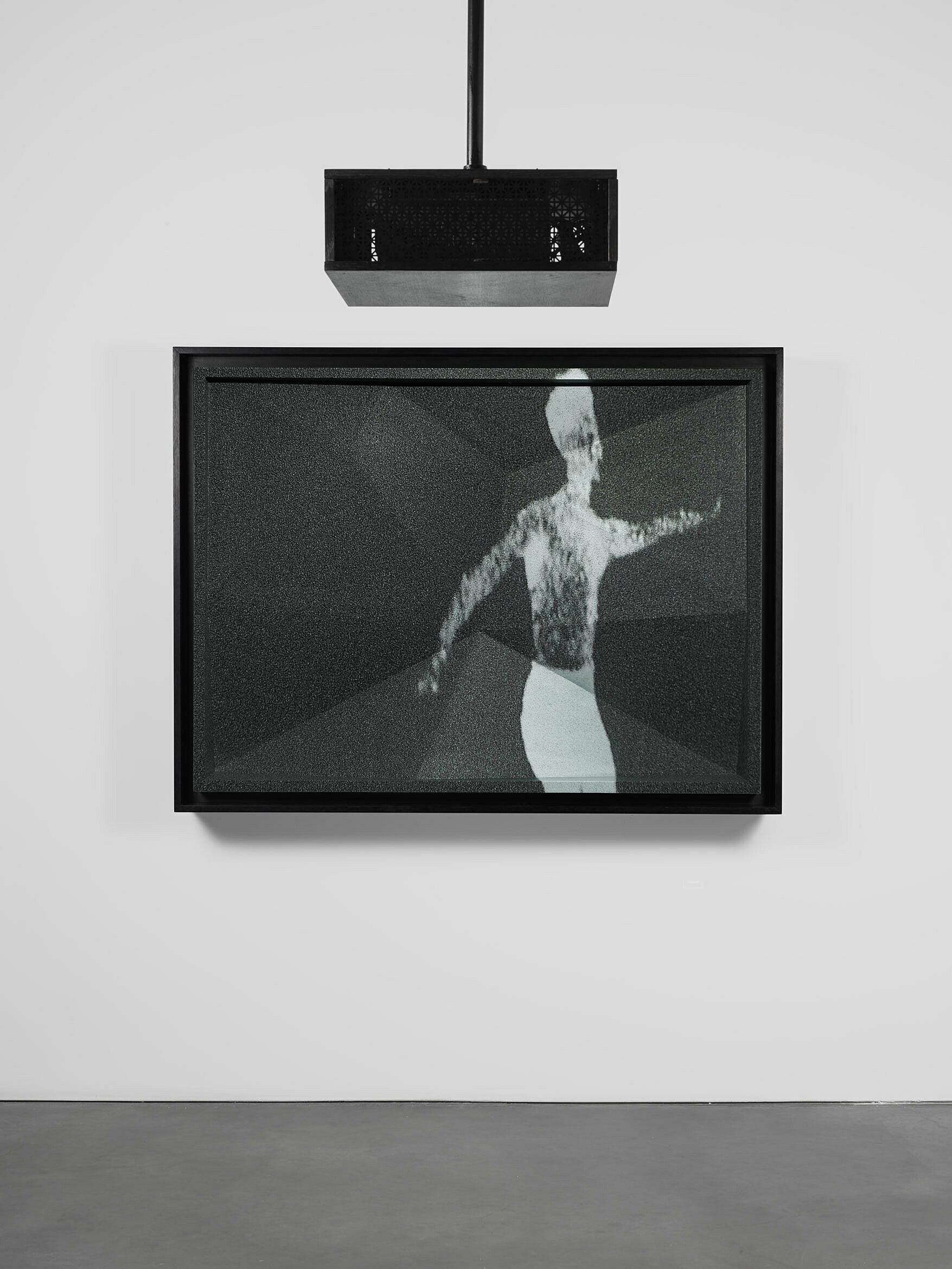 In Projection Painting II Josiah McElheny projects footage from filmmaker Maya Deren’s 1951 abandoned Ensemble for Somnambulists, which he reworked to further abstract its ghostly imagery, onto a painted form covered with a sheet of glass, superimposing the dark sky of the film onto both its painted planar surface and the glass above it. McElheny’s composite space indicates the possibility of a fourth dimension, its physical contours evoking the system of colored cubes known as “Tesseracts” that was invented in the nineteenth-century by the British mathematician and science-fiction writer Charles Howard Hinton to visualize what a four-dimensional space might look like.