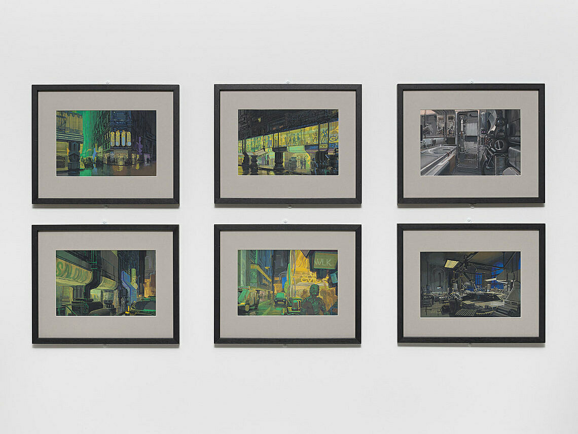 These gouaches by Syd Mead were essential in developing the look and feel of the futuristic city in Ridley Scott’s science-fiction classic Blade Runner (1982). The film revolves around the hunt to capture and destroy four “replicants”—powerful androids modeled on humans so closely as to be indistinguishable from them—whose return to Earth from their banishment in outer space poses an existential threat. The acidic colors and noir mood of the streets in Mead’s concept artwork create an atmosphere of uncertainty and paranoia that also permeates the laboratory of the replicants’ inventor, J. F. Sebastion, and the kitchen of their hunter, ex-police officer Rick Deckard.