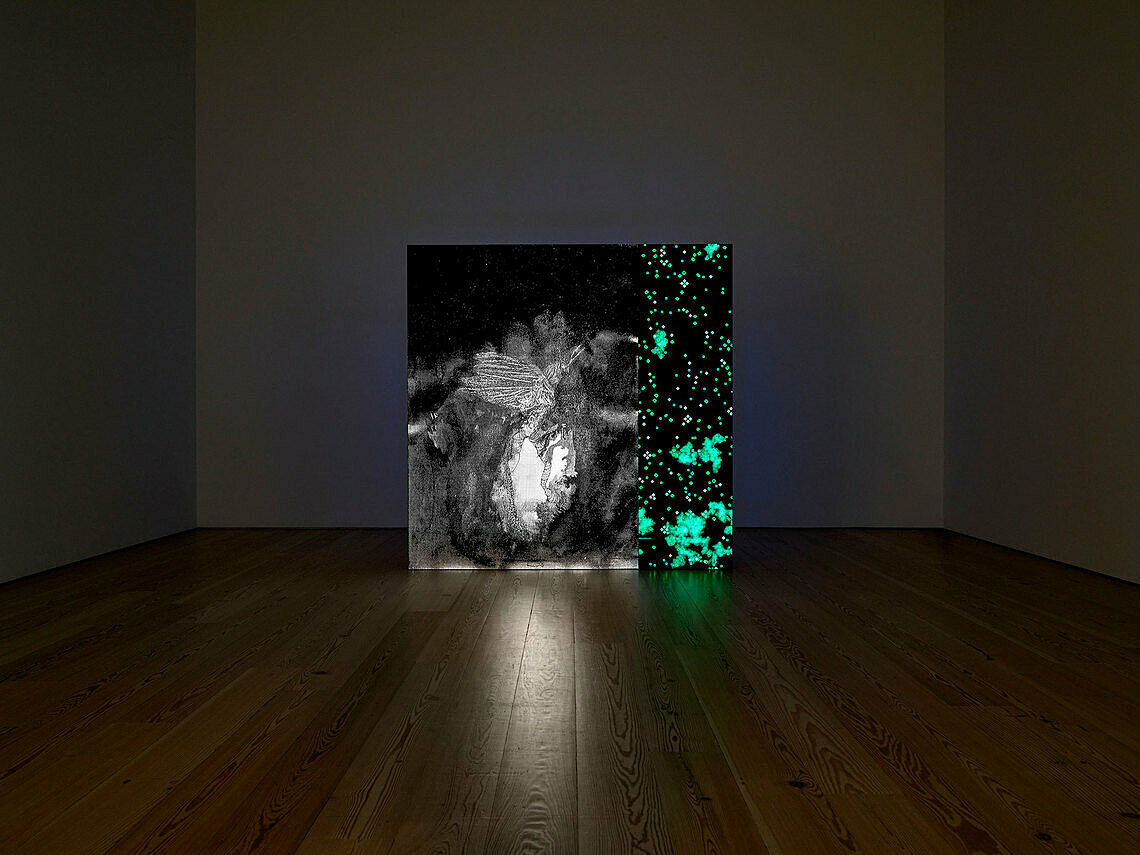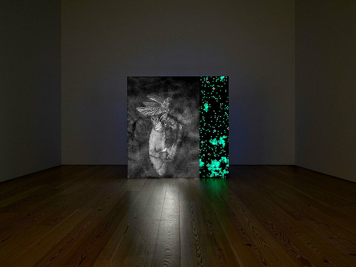 In Philippe Parreno’s installation, the screen is an automaton, teeming with life yet created from technology. Animated from hundreds of drawings, each firefly is like a living cell whose lifespan is modelled on the algorithms of mathematician John Horton Conway’s 1970 cellular automaton The Game of Life, a self-replicating robotic system developed to model cell growth. When each firefly’s sequence ends, its fleeting presence is frozen momentarily on the screen before disappearing. By fusing the handmade with technology and science, Parreno’s automaton echoes the cyborgian bodies that recur throughout the exhibition.