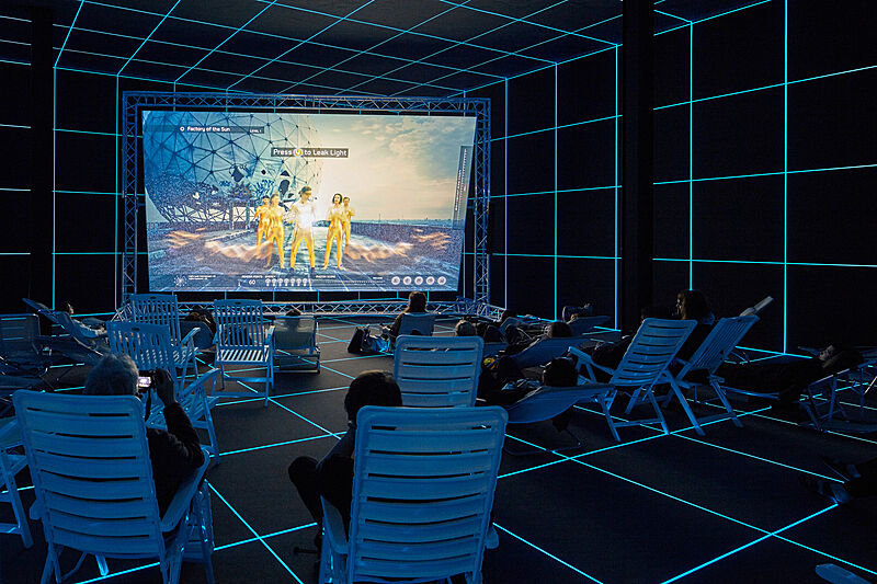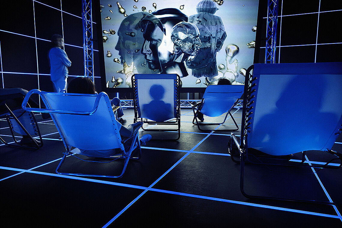 Hito Steyerl’s immersive three-dimensional grid is modeled on motion-capture studios, where body movements are recorded and translated for use in computer-generated imagery. The video on view within also features a motion-capture studio. In that one, workers are forced to dance in order to generate sunlight—though they also dance as a form of resistance to their data-mined servitude. The video shifts between mock newscasts, drone footage, and personal narratives, moving between different levels of reality like a video game. Simultaneously playful and critical, the work hints at the utopian potential of the Internet while also critiquing its use for surveillance and economic exploitation.